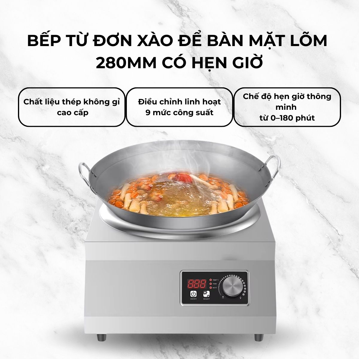 Bếp từ đơn xào để bàn mặt lõm 280mm có hẹn giờ giúp chế biến nhanh và hiệu quả các món ăn hấp dẫn