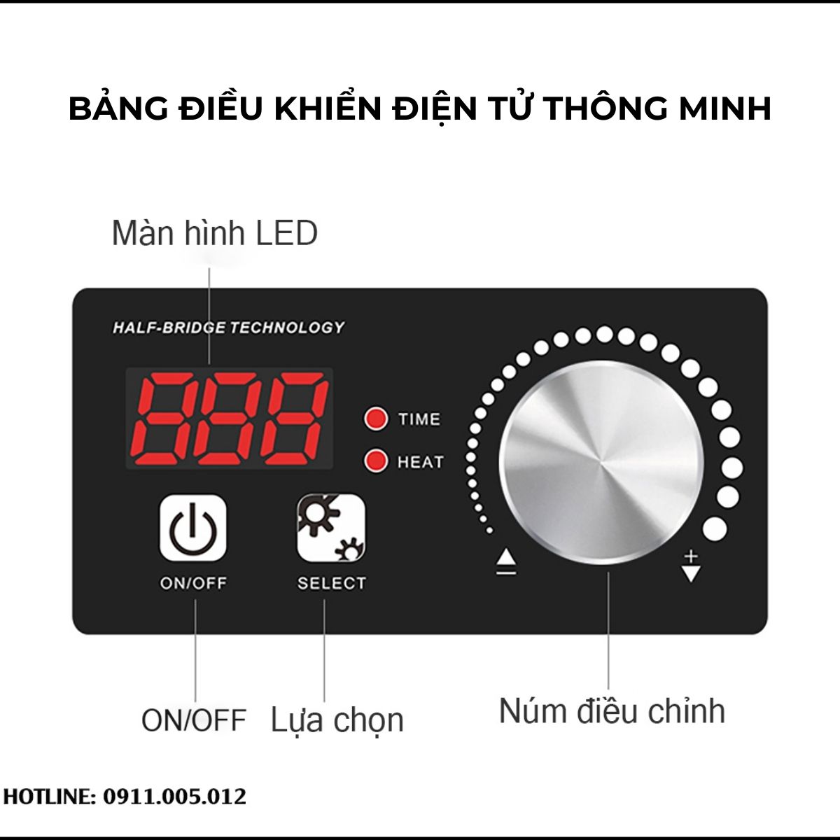 Cụm điều khiển được đặt ngay phía trước mặt bếp, gồm màn hình LED hiển thị rõ ràng và núm xoay điều chỉnh trực quan. Thiết kế này giúp người dùng dễ dàng thao tác, ngay cả với những đầu bếp mới sử dụng.