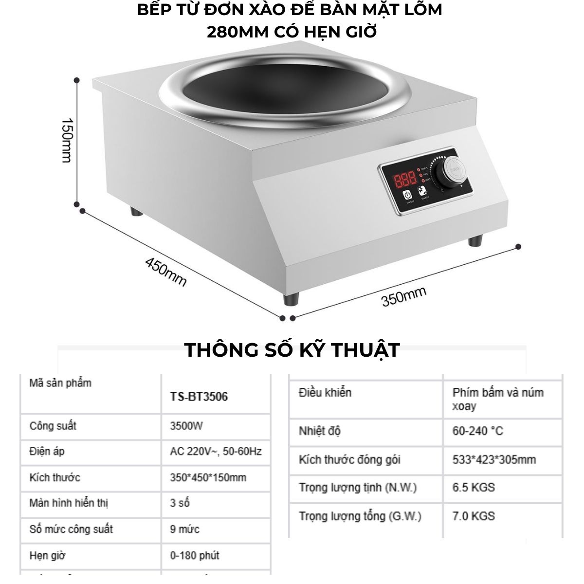 Đặc điểm cấu tạo của bếp từ đơn xào để bàn mặt lõm 280mm có hẹn giờ