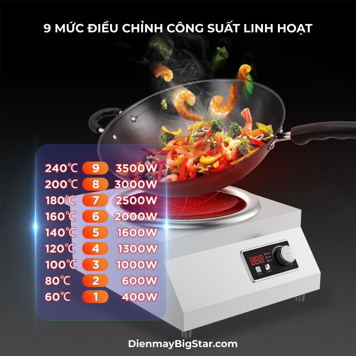 Với 9 mức công suất điều chỉnh, từ 400W đến 3500W, bếp từ đơn xào đáp ứng linh hoạt mọi nhu cầu chế biến từ giữ nóng đến xào chiên lửa lớn. Sự đa dạng này giúp đầu bếp dễ dàng kiểm soát nhiệt độ phù hợp cho từng món ăn.
