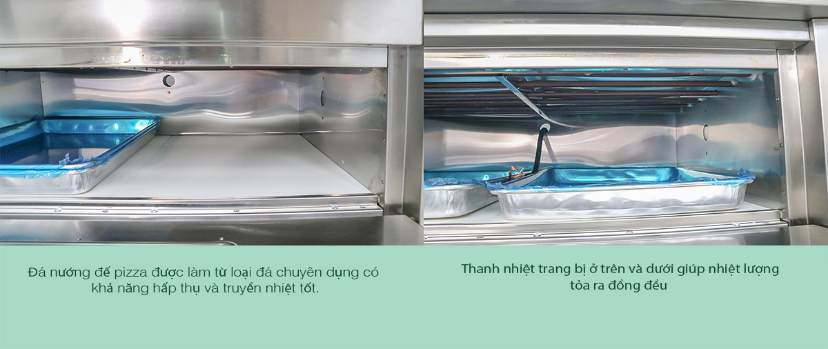 Đặc biệt, khoang lò còn được lót đá nướng, giúp vỏ bánh vàng giòn bên trong mềm xốp theo đúng tiêu chuẩn của bánh pizza.