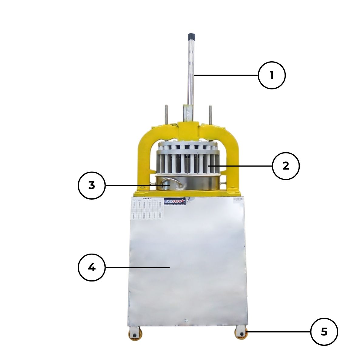 + Hệ thống dao cách với 36 lá cắt sắc bén, tạo ra nhát cắt ngọt lịm, giúp người dùng chia khối bột lớn thành 36 phần đều nhau. Mỗi phần có trọng lượng từ 30g – 180g, đáp ứng đa dạng nhu cầu sản xuất khác nhau của người dùng.