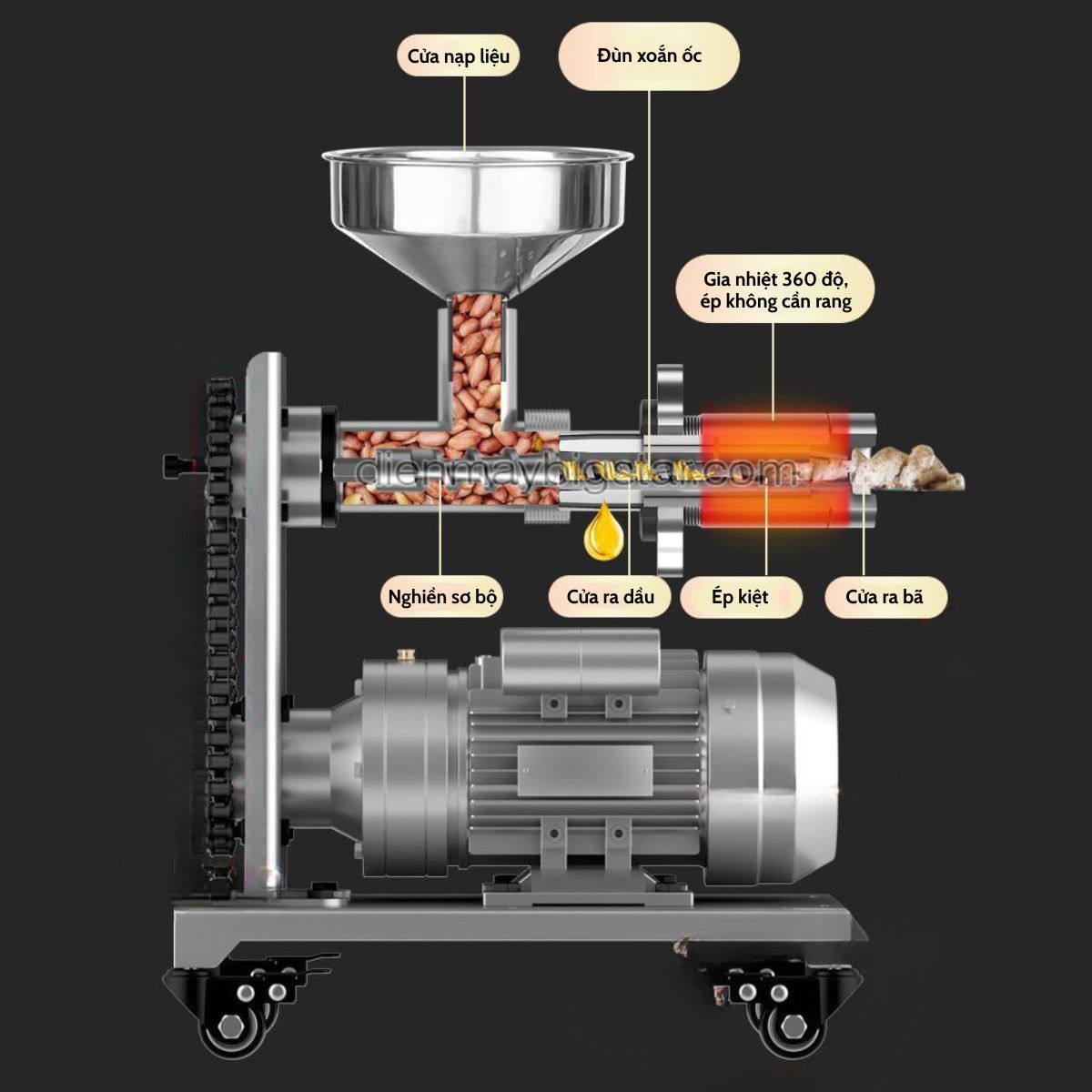 Hệ thống gia nhiệt được tích hợp để làm nóng nguyên liệu hoặc buồng ép trước và trong quá trình ép. Việc gia nhiệt giúp phá vỡ cấu trúc tế bào, tăng hiệu suất chiết xuất dầu và cải thiện chất lượng dầu thành phẩm.