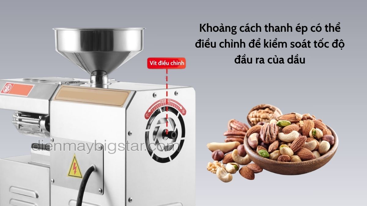 Tính năng điều chỉnh khe hở giữa trục vít và buồng ép cho phép người dùng tối ưu hóa áp lực ép tùy theo từng loại nguyên liệu khác nhau. Việc điều chỉnh này giúp nâng cao hiệu suất chiết xuất dầu, đảm bảo bã dầu có độ khô mong muốn và tăng tỷ lệ thu hồi dầu.