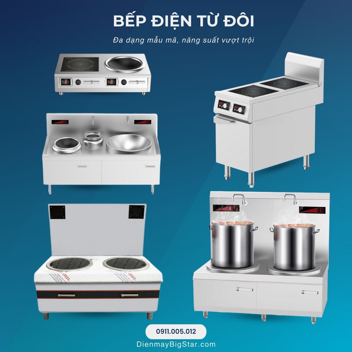 Điện máy BigStar hiện cung cấp đa dạng các mẫu bếp điện từ đôi mặt phẳng, bếp điện từ đôi mặt lõm, bếp điện từ đôi kết hợp lõm – phẳng, bếp điện từ đôi có bầu nước… đáp ứng mọi nhu cầu chế biến từ xào, chiên, luộc, hầm, nấu nước lèo cho đến nấu số lượng lớn trong bếp công nghiệp.